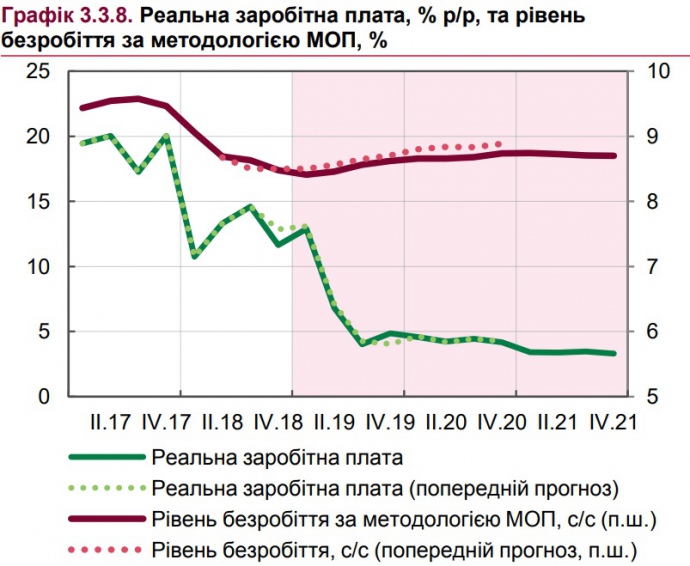 По мнению представителей Нацбанка, все еще высокий уровень безработицы (8,5 — 8,7%) на прогнозном горизонте будет обусловлен медленными темпами роста экономики на фоне жесткой монетарной и фискальной политики.
