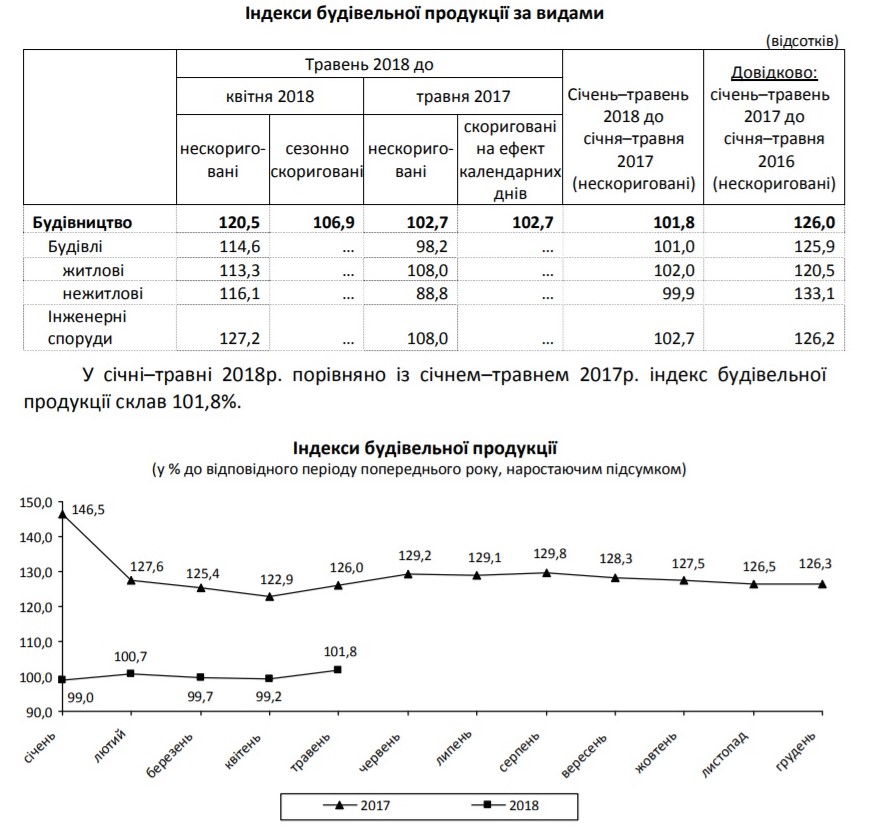 Ранее Госстат приводил данные, что в апреле по сравнению с мартом объем выполненных строительных работ в Украине сократился на 6,4% (с учетом сезонной корректировки) по сравнению с апрелем 2017 — на 8,1% (с корректировкой на эффект календарных дней). В январе-апреле соответствующий показатель уменьшился на 0,8% по сравнению с аналогичным периодом прошлого года.