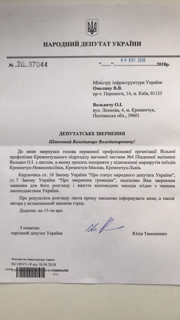 У Москву поїзд не зовсім скасували, його перекинули до обласного центру. Глава “Батьківщини” Юлія Тимошенко зібралася підтримати кременчуцьке депо, звернувшись до міністра інфраструктури Володимира Омеляна з проханням розглянути звернення.