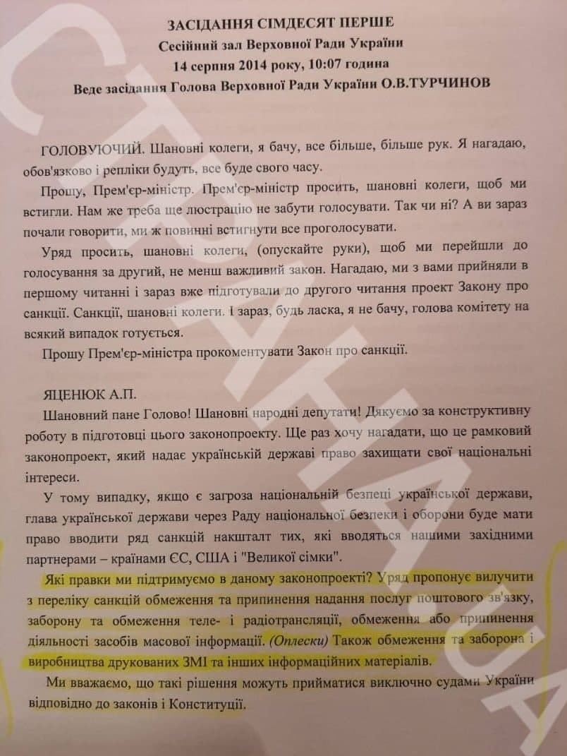 «Какие правки мы поддерживаем в этом законопроекте? Правительство предлагает исключить из перечисленных санкций ограничения и прекращения услуг почтовой связи, запрет и ограничение теле- и радиотрансляции, ограничение или прекращение деятельности СМИ и других информационных материалов. Мы считаем, что такие решения могут приниматься исключительно судами Украины в соответствии с законами и Конституцией», — сказал Яценюк.