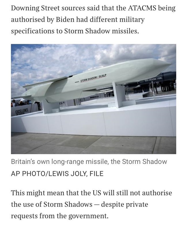 «Источники на Даунинг-стрит сообщили, что ракеты ATACMS, разрешенные к использованию президентом Байденом, имеют другие военные характеристики по сравнению с ракетами Storm Shadow. Это может означать, что США еще не дают согласия на использование Storm Shadow, несмотря на частные запросы со стороны правительства «, – говорится в материале.