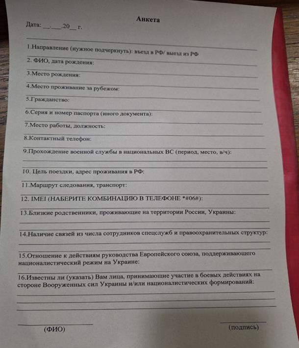 «От граждан требуют предоставить личные данные, в том числе указать место жительства в России и за рубежом, серию и номер паспорта, информацию о прохождении военной службы и цель поездки. Кроме этого они должны сообщить, где и кем они работают, контактный номер и идентификатор (IMEI) телефона. В конце идет блок вопросов, связанных с войной», — указывает издание.