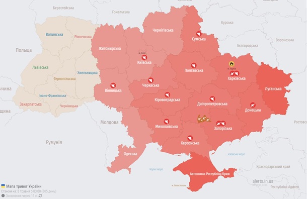 Тем временем, воздушная тревога из-за вражеских БПЛА охватила большую часть территории Украины, а также столицу.