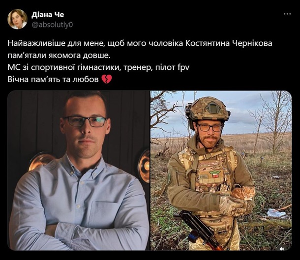 «Самое важное для меня, чтобы моего мужа помнили как можно дольше. Мастер спорта по спортивной гимнастике, тренер, пилот FPV. Вечная память и любовь», — написала Диана.
