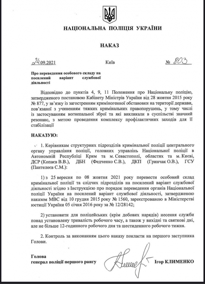 В то же время издание «Украинская правда» сообщает, что глава Нацполиции Игорь Клименко приказал с 25 сентября по 8 октября перевести весь личный состав криминальной полиции и следственных подразделений на усиленный режим работы. Скан соответствующего приказа размещен на сайте издания.