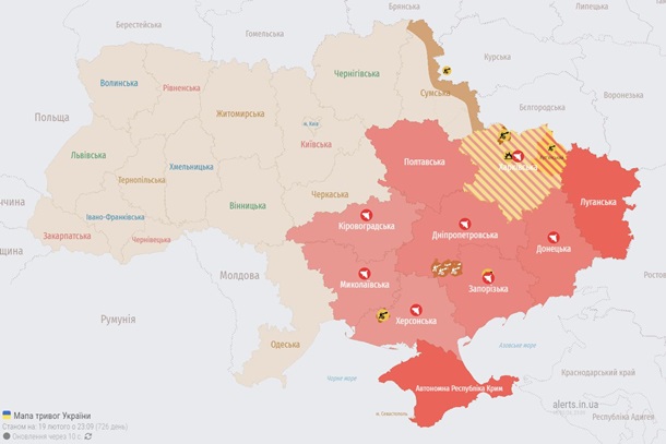 Вечером в понедельник, 19 февраля, российские оккупанты запустили несколько групп ударных БПЛА. Воздушная тревога охватила весь Восток и значительную часть Юга Украины.