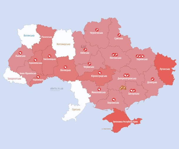 Воздушная тревога объявлена во всех восточных и центральных регионах, а также в большинстве западных.