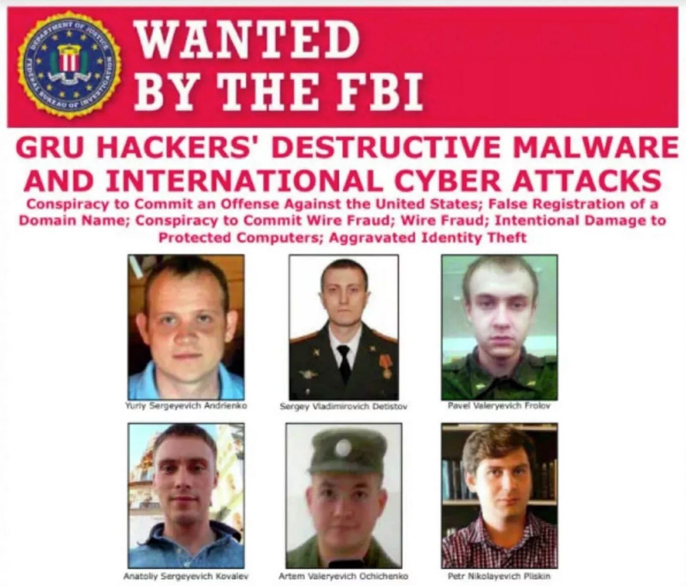 Кроме того, представитель минюста США заявил на пресс-конференции, что шесть обвиняемых – действующие и бывшие сотрудники ГРУ которые, среди прочего, якобы вывели из строя компьютеры на Олимпиаде в Южной Корее.