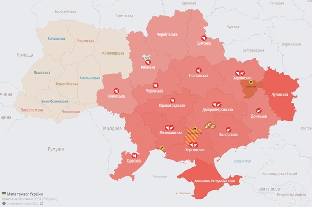 В ночь на вторник, 30 января, воздушная тревога из-за вражеских беспилотников продолжается в большинстве областей Украины. В частности, она объявлена на всем востоке, юге и центре страны.