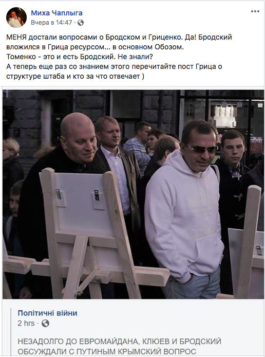 «МЕНЯ достали вопросами о Бродском и Гриценко. Да! Бродский вложился в Грица ресурсом… в основном Обозом. Томенко — это и есть Бродский. Не знали? А теперь еще раз со знанием этого перечитайте пост Грица о структуре штаба и кто за что отвечает», — написал политтехнолог.