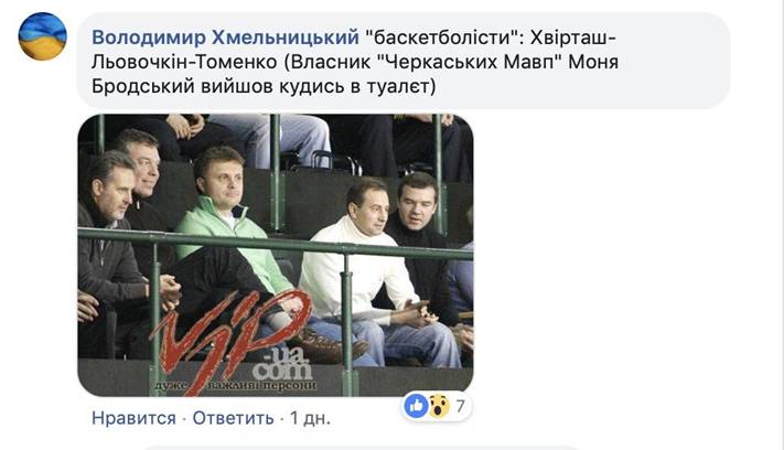 После этого один из пользователей соцсети добавил в комментарии фотографию Николая Томенко с баскетбольного матча. На фото, судя по всему, политик находится в киевском спорткомплексе «Меридиан», где проводил свои матчи БК «Будивельник» и БК «Киев». По правую руку от него сидели экс-глава Администрации президента Януковича Сергей Левочкин, баскетбольный функционер Александр Волков и олигарх Дмитрий Фирташ. К слову, именно Бродский является президентом Федерации баскетбола Украины.