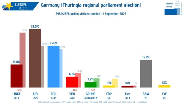 По данным экзит-поллов, AfD наберет 33,5% голосов в земле Тюрингия, что значительно больше, чем 24,5% консервативной партии Христианско-демократический союз. В соседней земле Саксония консерваторы лидировали с 32%, лишь на полпроцента опережая AfD.