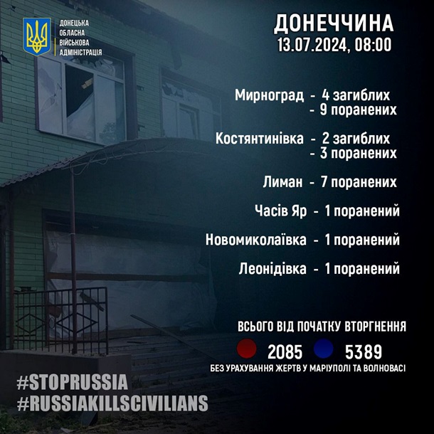 «Россия убивает гражданских! За 12 июля россияне убили 6 жителей Донетчины: 4 в Мирнограде и 2 в Константиновке. Еще 22 человека в области за сутки получили ранения», — говорится в сообщении.