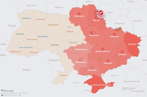 По состоянию на 0.45, воздушная тревога из-за БПЛА, УАБов и баллистики охватила восточную часть Украины.