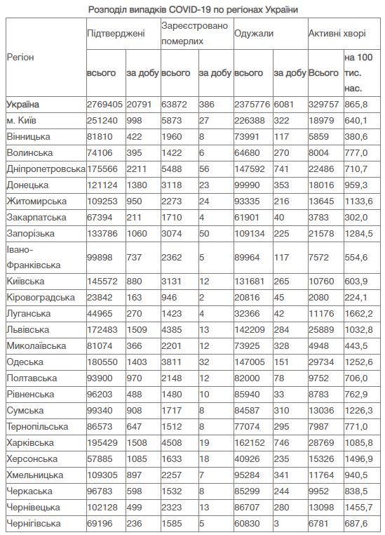 Как сообщалось, за сутки 23 октября в Украине зафиксировано 20 791 новый подтвержденный случай коронавирусной болезни COVID-19 (из них детей — 1533, медработников — 237). Госпитализировано — 5 924 человека; летальных случаев — 386; выздоровели — 6 081 человек.
