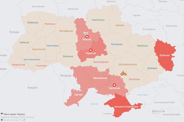 В настоящее время воздушная тревога из-за угрозы БПЛА объявлена в ряде южных областей, а также в Киевской и Черкасской областях.