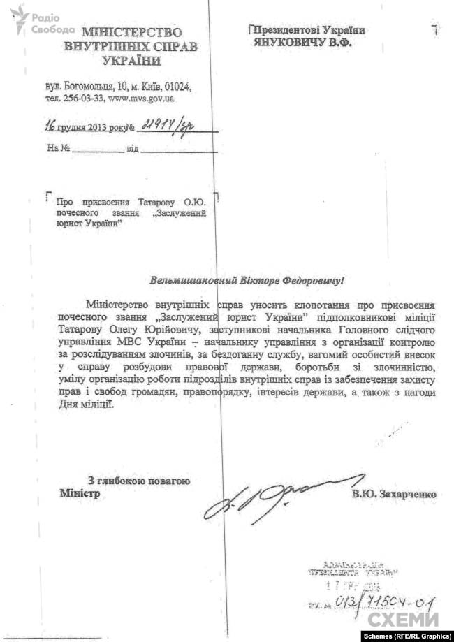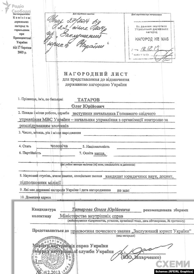Заместитель руководителя Офиса президента Олег Татаров в разгар Майдана получил звание «Заслуженный юрист Украины» от Виктора Януковича по личному представлению тогдашнего министра внутренних дел Виталия Захарченко — «за внедрение в жизнь решений президента, Верховной Рады и Кабинета Министров, направляя усилия подчиненных работников на усиление борьбы с преступностью и укрепления правопорядка в государстве». На момент награждения Татаров занимал должность заместителя руководителя Главного следственного управления МВД и регулярно публично комментировал события на Майдане, распространяя обвинения в адрес активистов. Об этом сообщают журналисты программы «Схемы», которые получили эти документы в свое распоряжение.