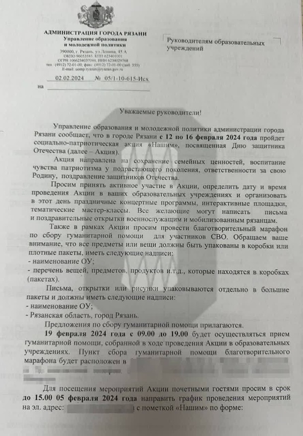 «Руководители рязанских образовательных заведений получили такое распоряжение от администрации города, в котором от них требовали провести «благотворительный марафон по сбору гумпомощи для участников СВО». Его предлагалось организовать в рамках социально-патриотической акции «Нашим», посвященной Дню защитника Отечества. Уточняется, что акция направлена на «сохранение семейных ценностей, воспитание чувства патриотизма у подрастающего поколения, ответственность за свою Родину», — говорится в сообщении.