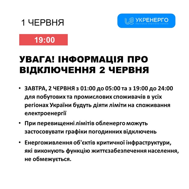 Во всех областях Украины в воскресенье, 2 июня, с 01.00 до 05.00 и с 19.00 до 24.00 для бытовых и промышленных потребителей будут действовать лимиты на потребление электроэнергии. Об этом сообщила пресс-служба Укрэнерго.