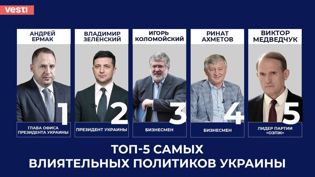 Всеукраинская газета «Вести» назвала Топ-100 самых влиятельных украинцев и явлений 2021 года. В первой пятерке — глава Офиса президента Андрей Ермак, сам президент Владимир Зеленский, олигархи Ринат Ахметов и Игорь Коломойский. Замыкает первую пятерку лидер партии «Оппозиционная платформа — За жизнь» Виктор Медведчук. В первую десятку вошли также экс-спикер Дмитрий Разумков, санкции, которые были введены СНБО в отношении лидера оппозиции, его окружения, а также ряда других бизнесменов, и другие представители команды Зеленского — премьер-министр Денис Шмыгаль, заместитель Ермака Кирилл Тимошенко, министр цифровой трансформации Михаил Федоров.
