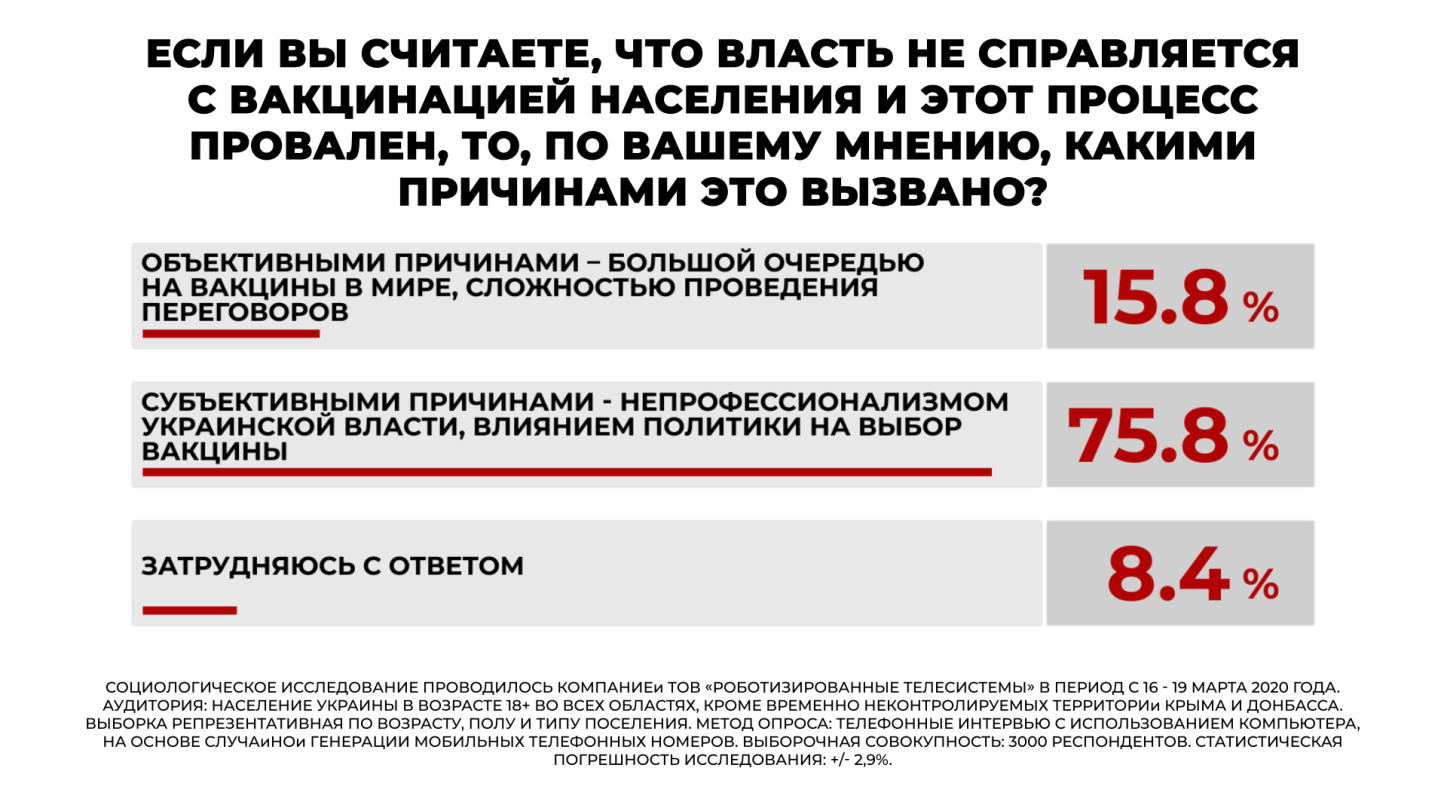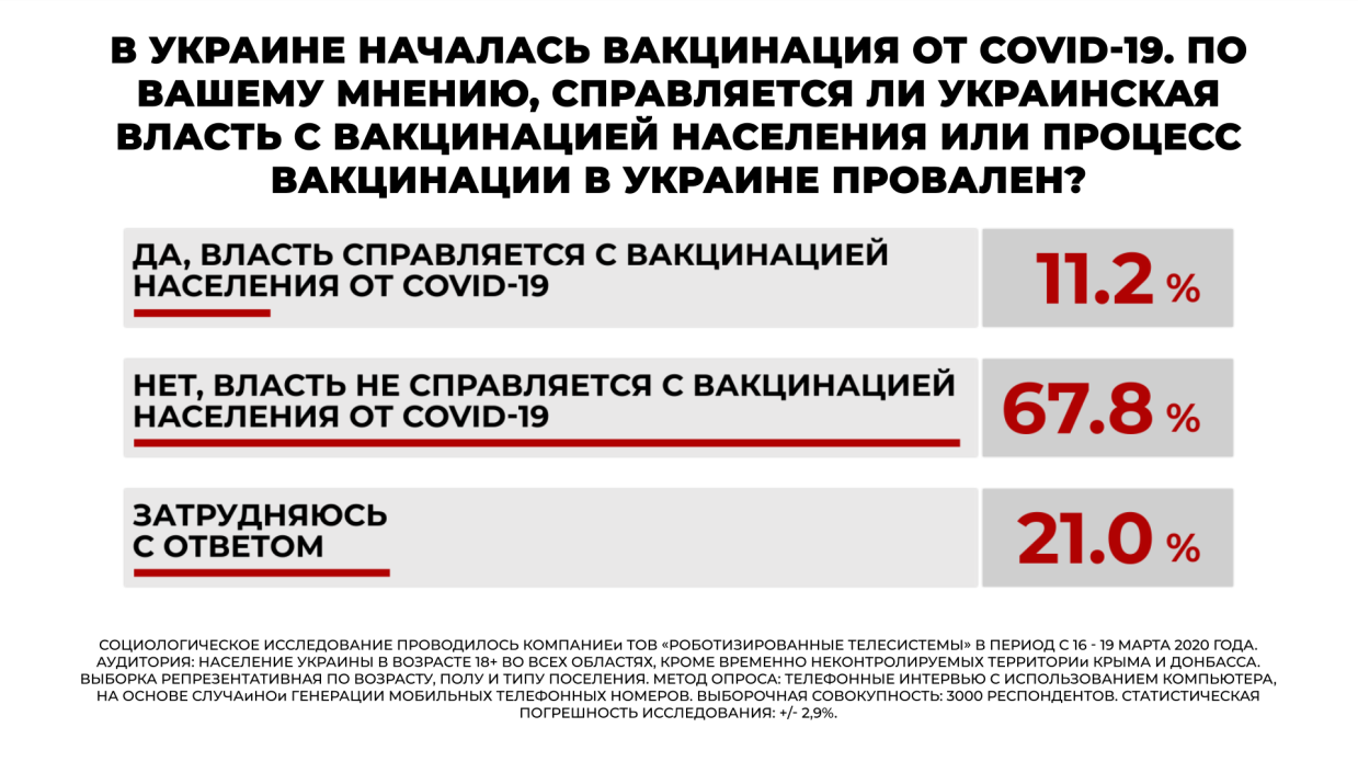 Нынешняя власть полностью провалила процесс вакцинации населения от Covid-19. Так считают 67,8 % респондентов, опрошенных в рамках социологического исследования, проведенного 16–19 марта 2021 года компанией RTS («Роботизированные телесистемы»).